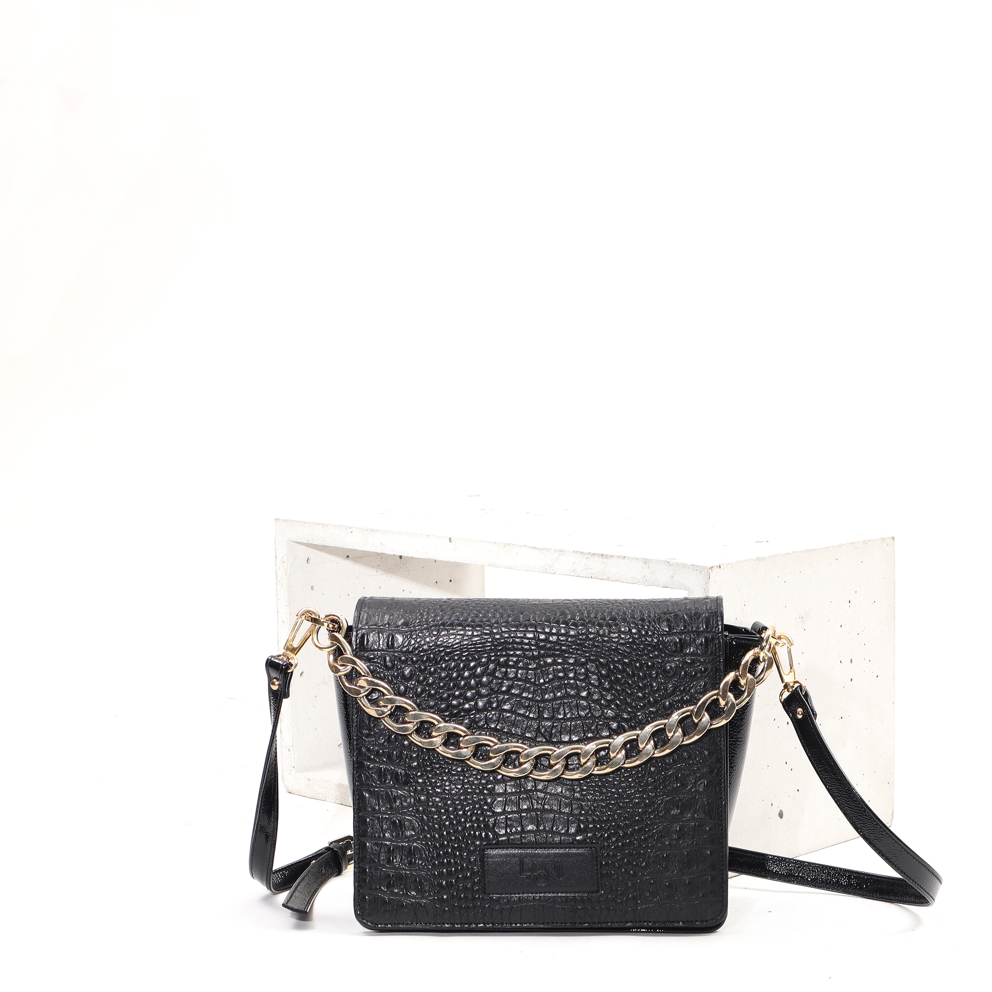 Színe: alaptáska: fekete, fedelek: dombornyomott fekete croco és arany kígyó minta