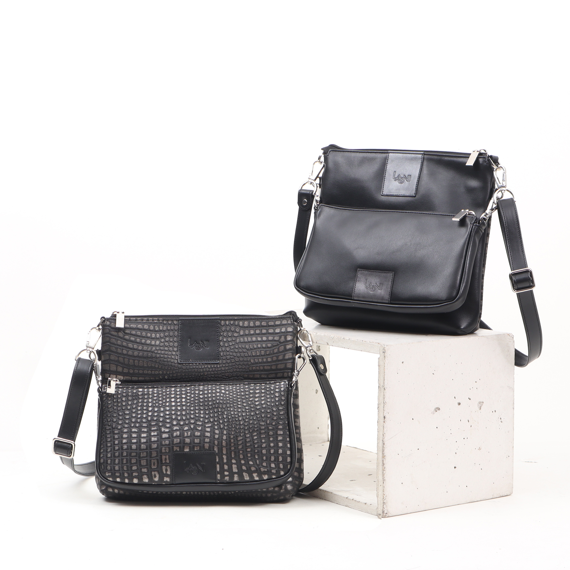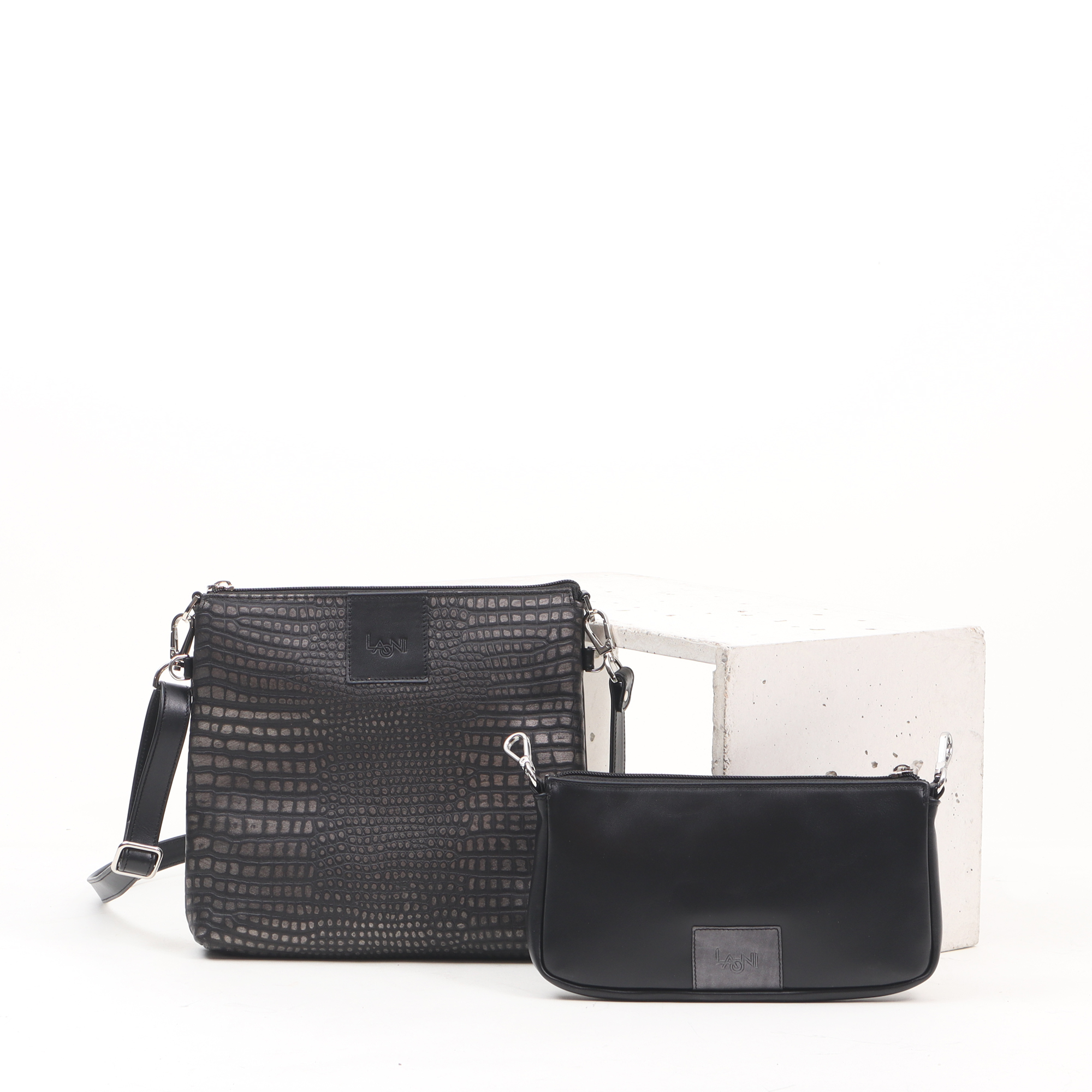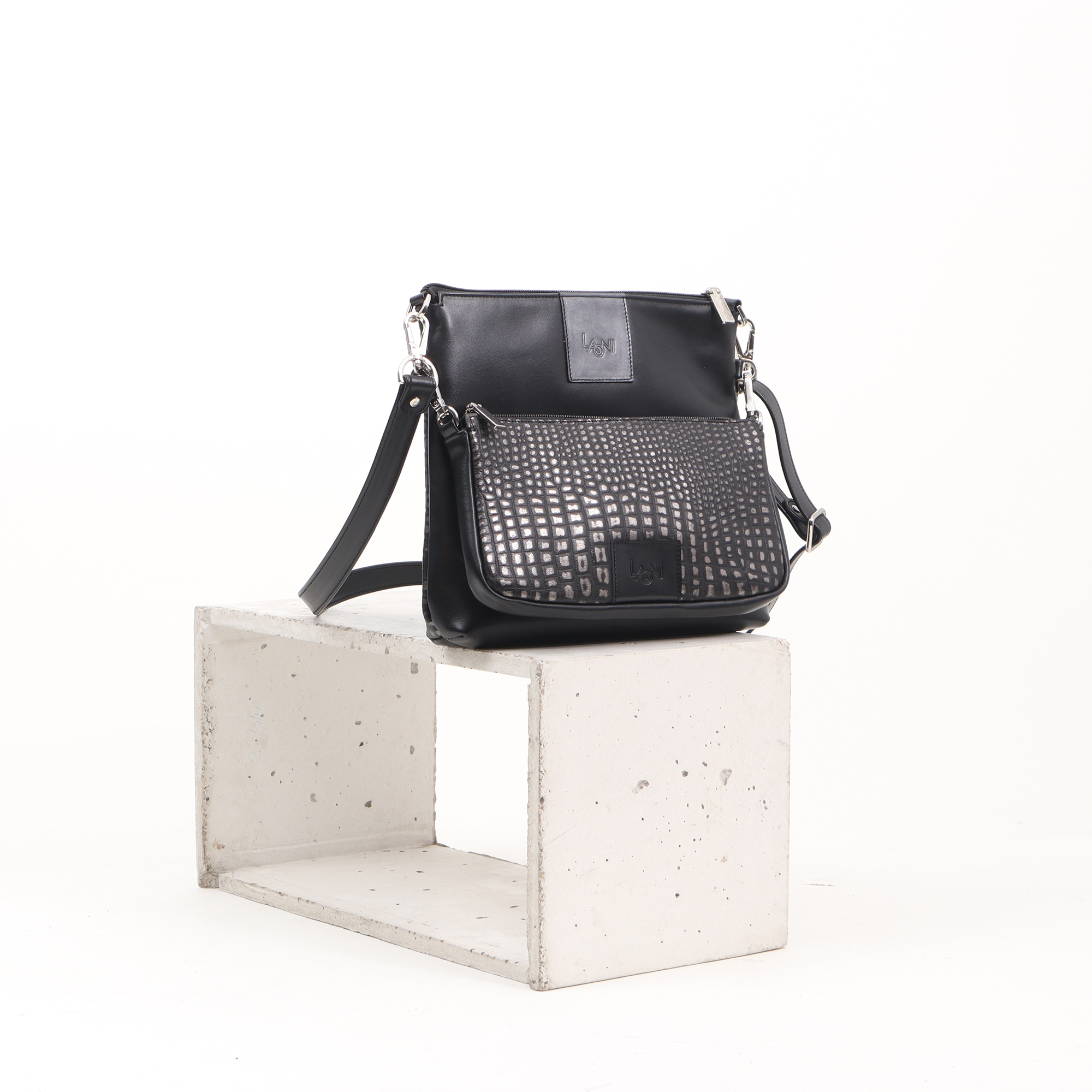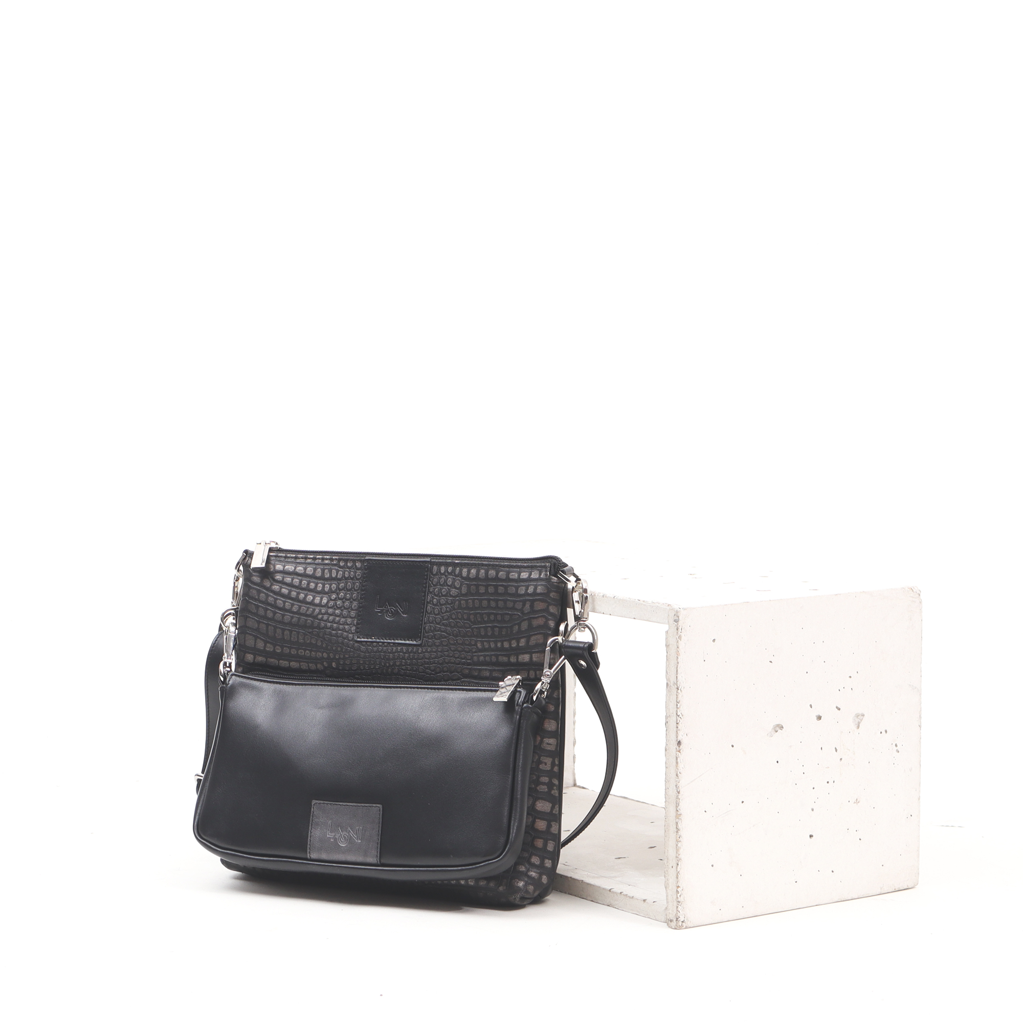 Color: black and metallic gray embossed croco pattern