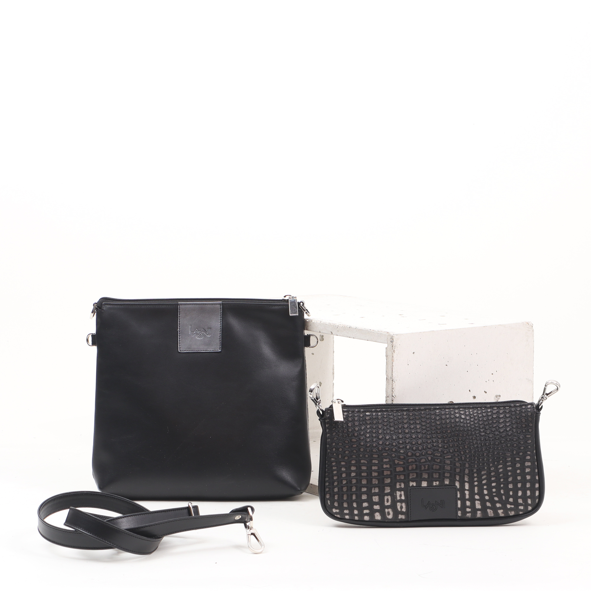 This bag is part of the Chameleon Everyday collection. Both pieces close with a zipper. The larger bag has a mobile phone holder and a zipped pocket inside. Inside the smaller bag there is a partition that divides it into two sections. The shoulder strap is adjustable in length.